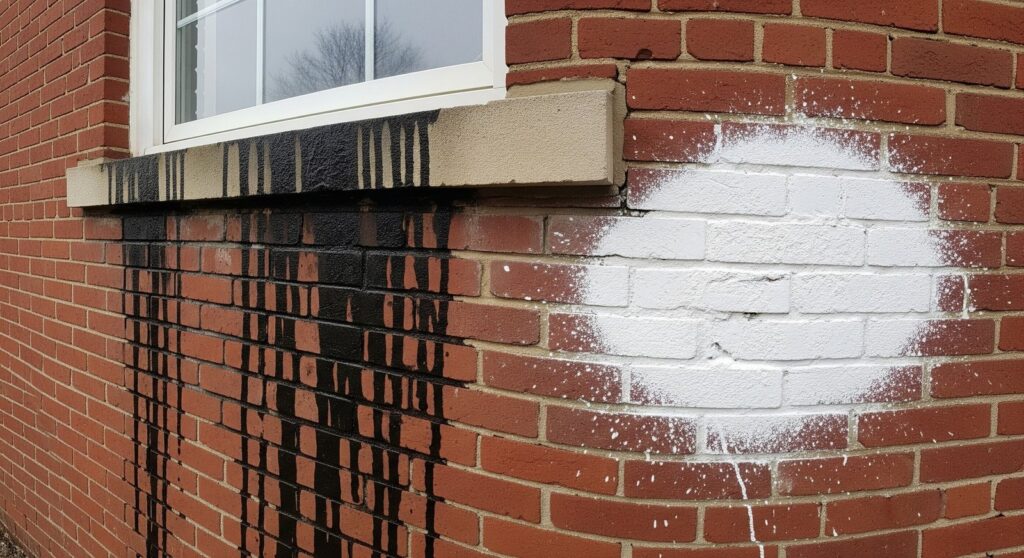 Efflorescence appears as a white, powdery film on masonry. As water moves through the material, it dissolves salts and brings them to the surface, where the water evaporates and leaves the salt behind. The powder itself is harmless, but it proves that water is moving through your wall.