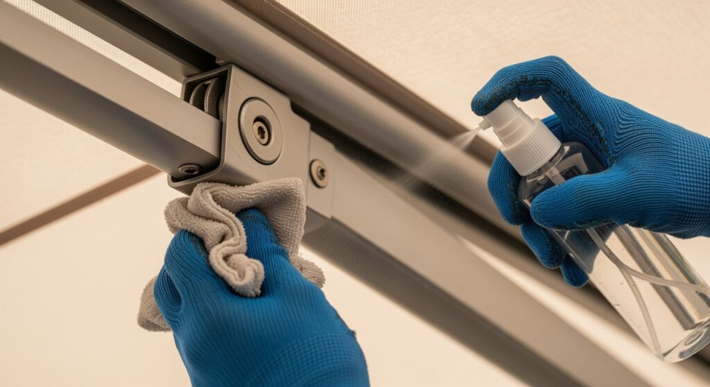 - Motorized units: Don’t spray water on motors or controls. Unplug power before cleaning nearby parts. Wipe with a damp cloth and lube moving joints with silicone- or paraffin-based spray (avoid WD-40, which attracts dirt).